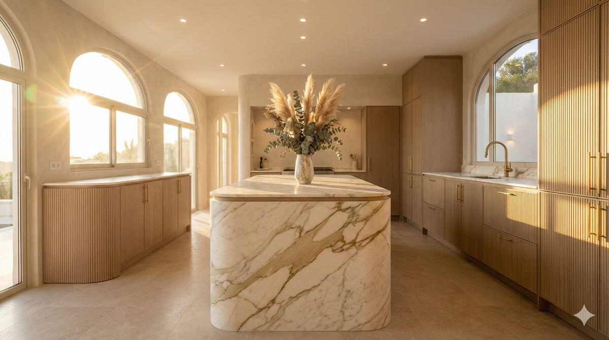 Prezentowana realizacja to kwintesencja najnowszego trendu Modern Organic, w którym surowa geometria ustępuje miejsca łagodnym, naturalnym liniom. Projekt ten wyróżnia się zaokrągloną wyspą kuchenną oraz mistrzowskim połączeniem tekstur: głębokich ryflowań na frontach, szczotkowanego mosiądzu oraz marmuru Calacatta z charakterystycznym, złotym użyleniem. Jako eksperci od mebli na wymiar, gwarantujemy 100% wykorzystania przestrzeni – bez zbędnych listew maskujących, z perfekcyjnym spasowaniem elementów. To rozwiązanie dla Inwestorów, którzy oczekują nie tylko funkcjonalności, ale także unikalnego, "dotykowego" doświadczenia we własnym domu.