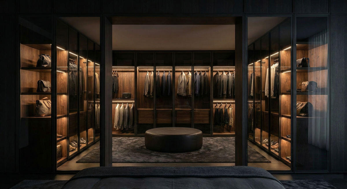 Kluczem do odbioru tego wnętrza jest gra światłem. Zamiast ostrego oświetlenia górnego, zastosowano ciepłe listwy LED ukryte wewnątrz półek. Tworzy to nastrojowy, niemal intymny klimat ("moody atmosphere"), w którym złociste światło wydobywające się z szaf dramatycznie kontrastuje z ciemniejszym otoczeniem pokoju. Taki zabieg pozwala na perfekcyjne wyeksponowanie faktur drewna, szkła oraz kolekcji ubrań high-end.